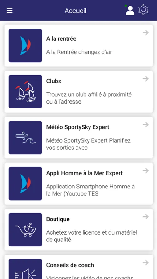 Dans votre espace de dialogue personnel avec la Fédération Française de Voile, vous trouverez, toute l’actualité de la Fédération, Ligue et Club (Tourisme, Sport-Santé, Loisir, Compétitions) ainsi que de nombreuses rubriques utiles pour savoir où et comment naviguer ou participer à des manifestations nautiques. Vous y trouverez aussi vos résultats et pourrez y construire et suivre votre saison sportive … et bien d’autres fonctionnalités … météo …