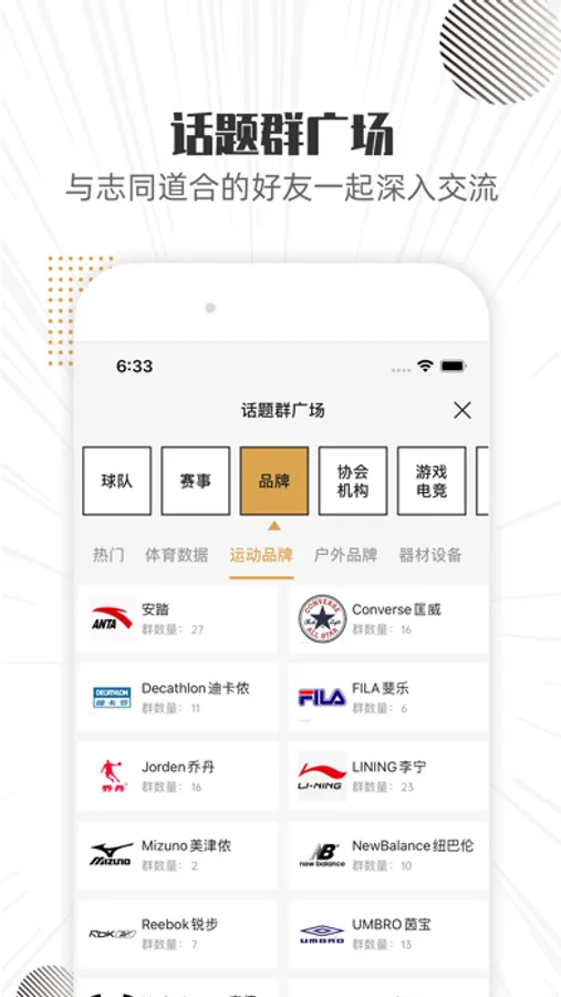 【话题群广场】这里有体育相关的各种话题分类,包括足球篮球赛事,各种体育品牌等,您可以在任意分类下创建您自己的话题群。