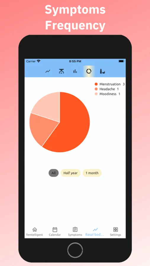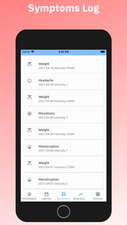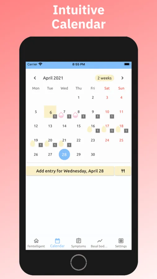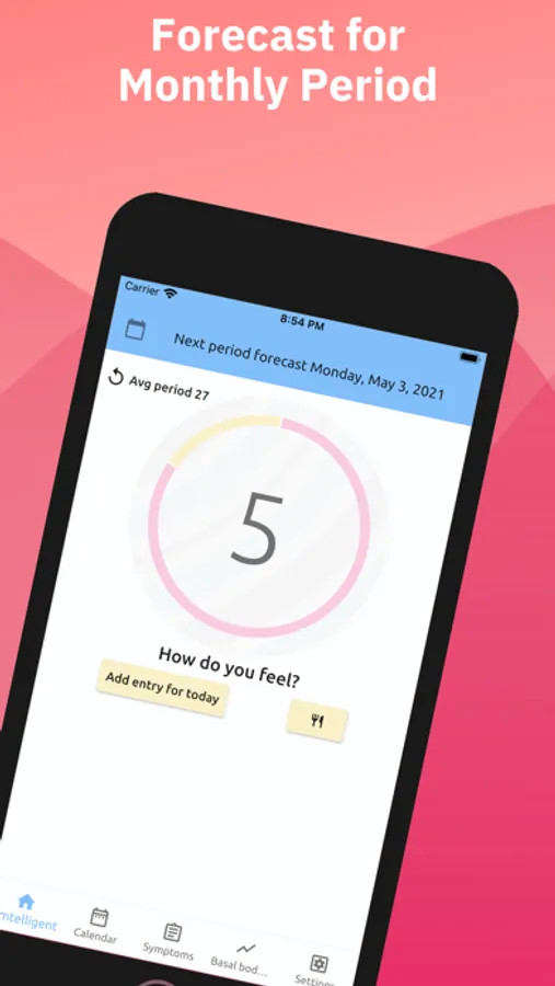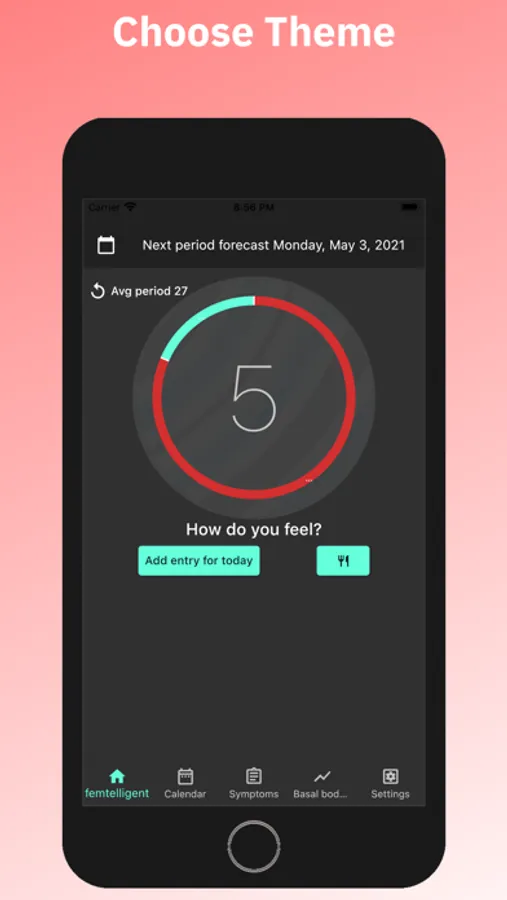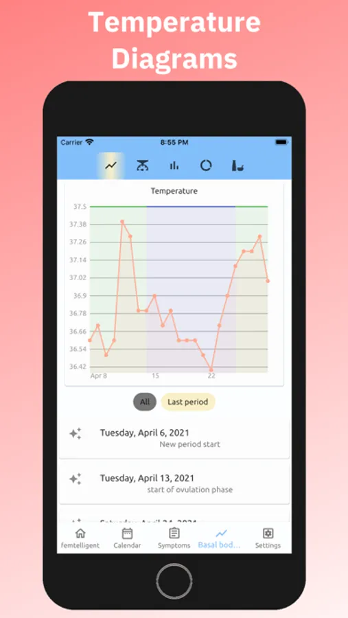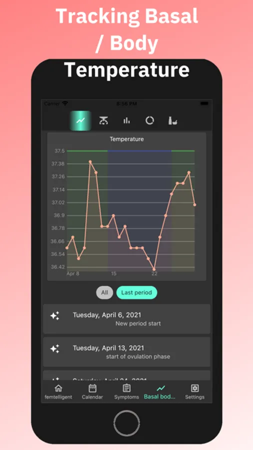 Femtelligent adapts with machine learning (AI) to your period cycle, it learns based on the input data, and forecasts the start date of the next cycle. Even with irregular period, the app should adapting to automatically on the cycle. In additional to the period cycle, you can record your basal temperature to see the time of your ovulation. The basal temperature is the natural way for either conception or birth control. To keep track of other symptoms like acne or moods you can use our simple user interface.