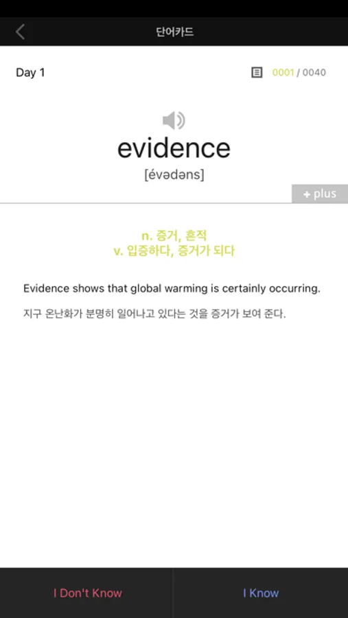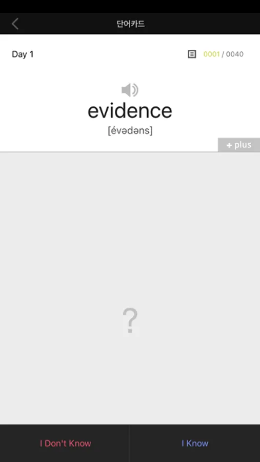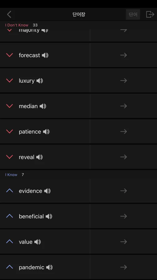 2. 단어장 : 워드마스터에 특화된 단어 암기장! 단어카드의 학습 결과에 따라 ‘I don’t Know’와 ‘I Know’로 구분된 단어에 대한 심화 학습이 가능합니다. 단어를 보고 뜻을 암기하거나 뜻을 보고 단어를 암기할 수 있습니다.
