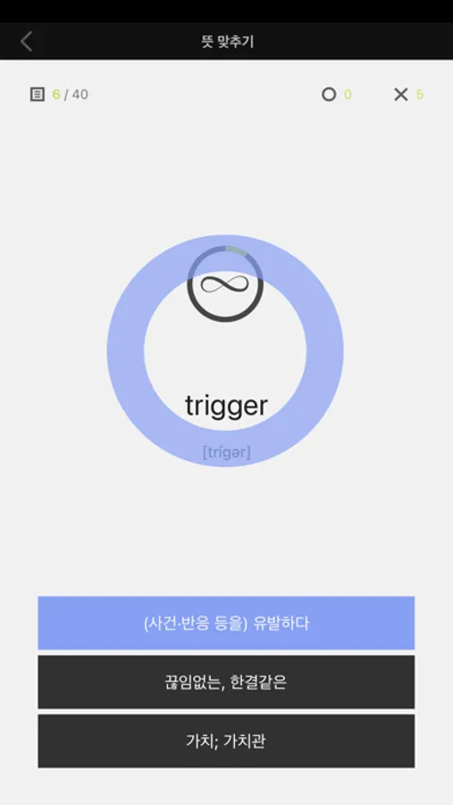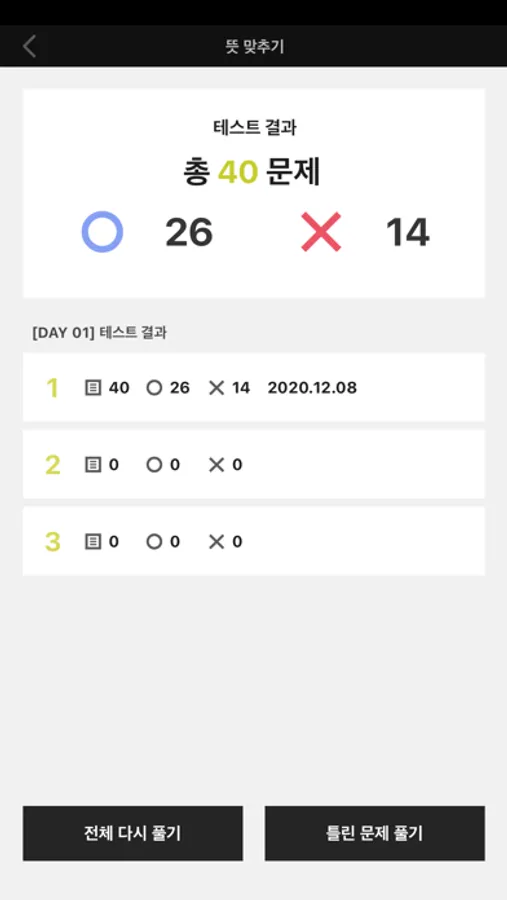 4. 뜻 맞추기/단어 맞추기 : 암기한 단어는 단어테스트를 통해 확인하고 복습할 수 있습니다.