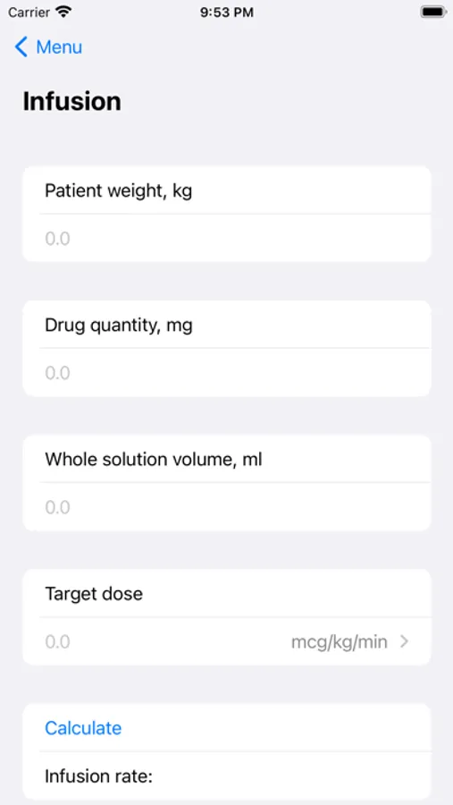 Infusion rate is calculated to get the exact value of different drugs infused by syringe pumps as ml/h while targeting any definite dosage in mg/kg/min, mg/kg/h, mcg/kg/min, mcg/kg/h.