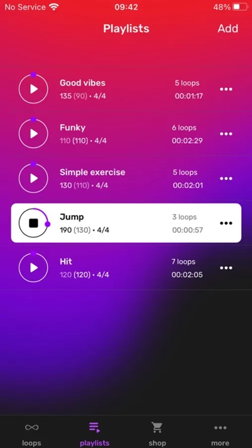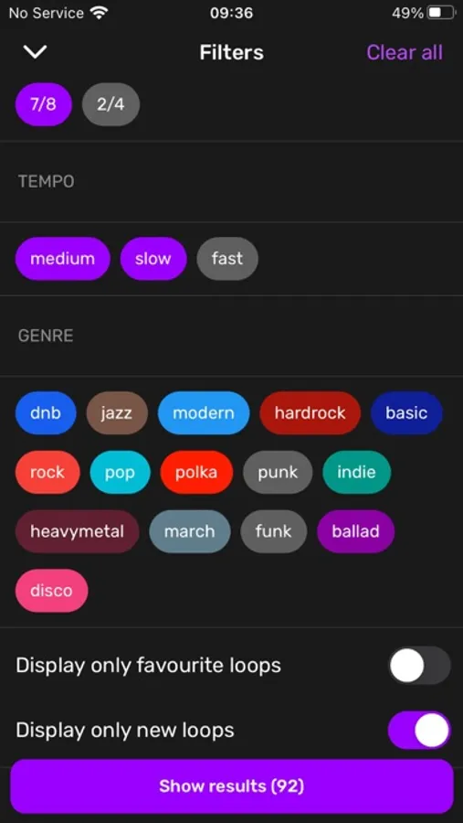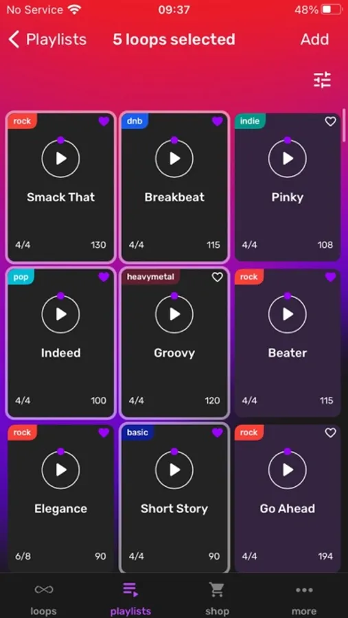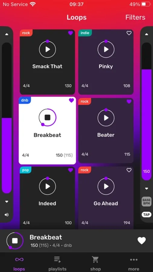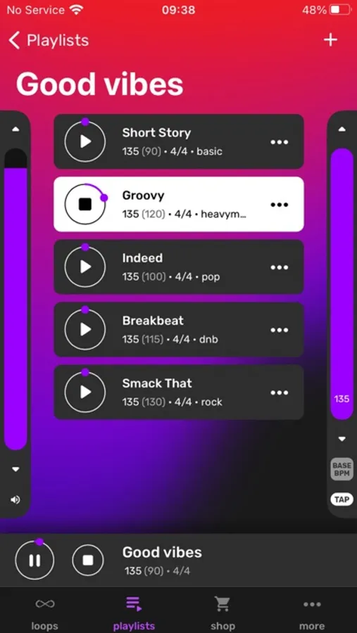 You can sort beats by BPM, genre (funk, hard rock, indie, pop, punk, modern, etc.), tempo, and others. If you want - choose your favorite tracks and make your own playlist.