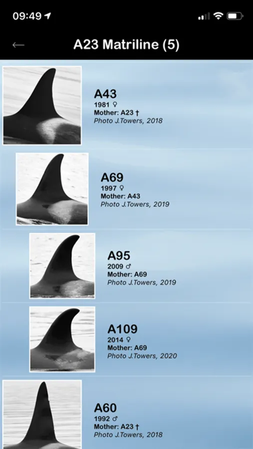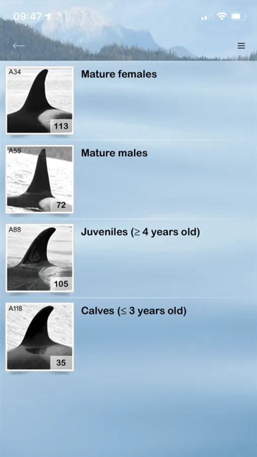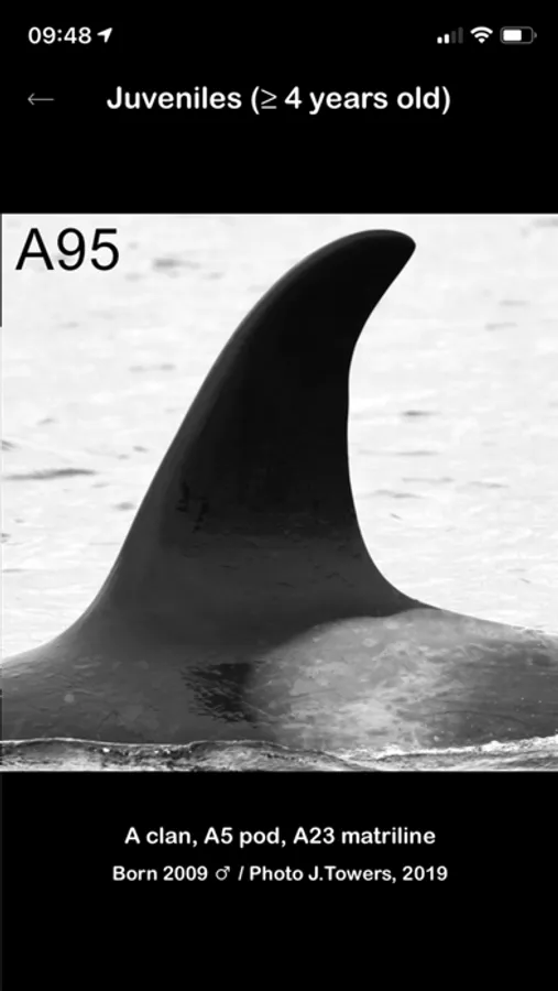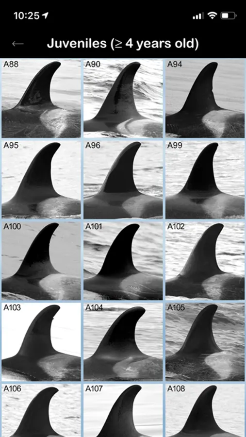 This application provides up to date identification images of all live individuals belonging to the Northern Resident killer whale population. Annual updates will include the addition of images for new calves, revised images for individuals whose appearance has significantly changed and relevant notes. You can navigate by Clan, Pod and Matriline, or by sex and age class. In the ALL section, "Mature females" include all females 15 years of age or older, individuals over 14 who have not sprouted and any younger individuals who have given birth. "Mature males" include all individuals who have started sprouting, males with a dorsal fin that has reached its maximum height after sprouting, and all known males over 14 who have not started sprouting yet. "Juveniles" include all individuals aged between 4 and 14 years old and "Calves" include all individuals aged 3 or less. Individuals in the ALL section are arranged alphanumerically by name, whereas in the Matriline view, they are first laid out by generation, each of which is indented, and secondly by birth year. Identification images of each killer whale include information about the individual (name, sex, birth year, mother) and information about the image (photographer and year taken). Each image can be visualized in full screen by clicking on it. The News section provides information on the status of individuals in the Northern Resident killer whale population.