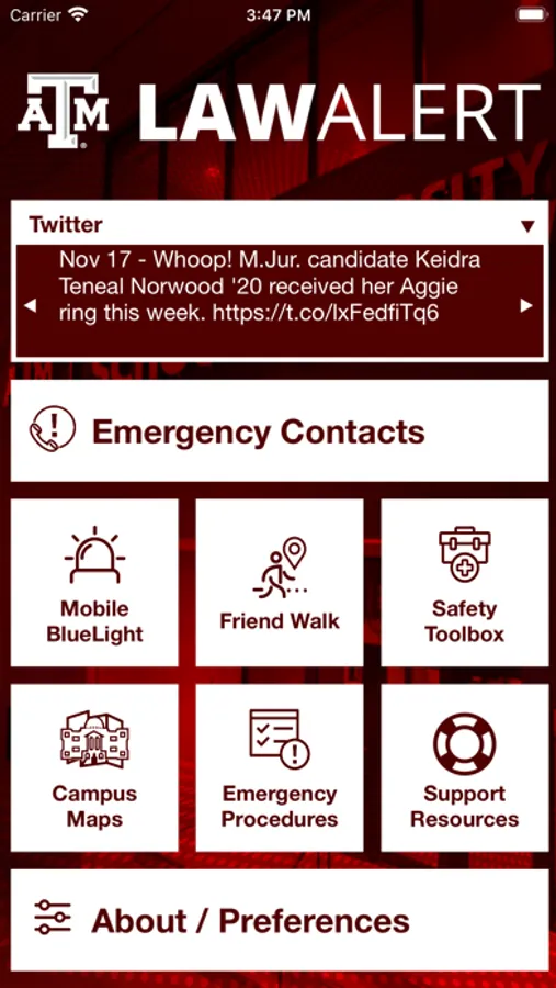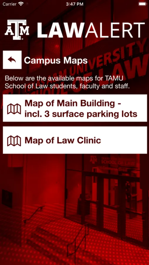 Law Alert is the official safety app of Texas A&M University School of Law. It is the only app that integrates with Texas A&M University School of Law's safety and security systems. This is a unique app that provides students, faculty and staff with added safety on the Texas A&M University School of Law campus. The app will send you important safety alerts and provide instant access to campus safety resources.