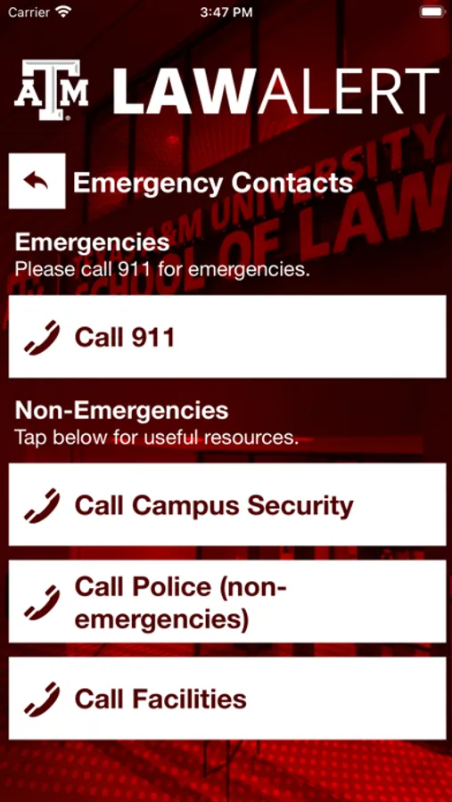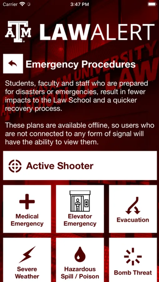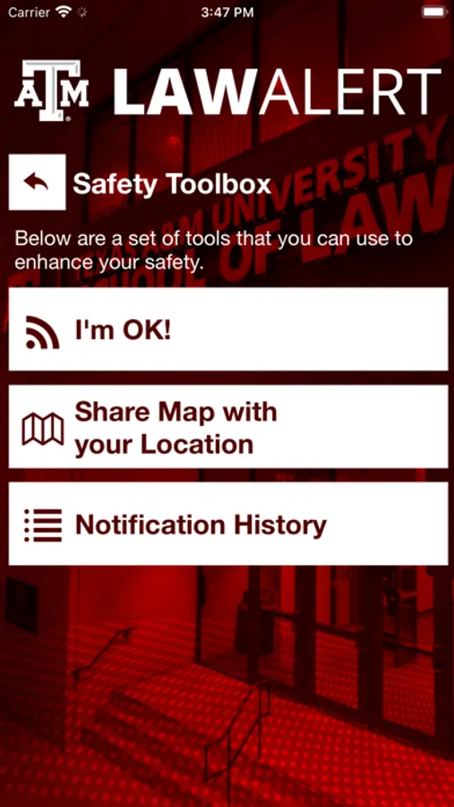 - Safety Notifications: Receive instant notifications and instructions from Texas A&M University School of Law safety when on-campus emergencies occur.