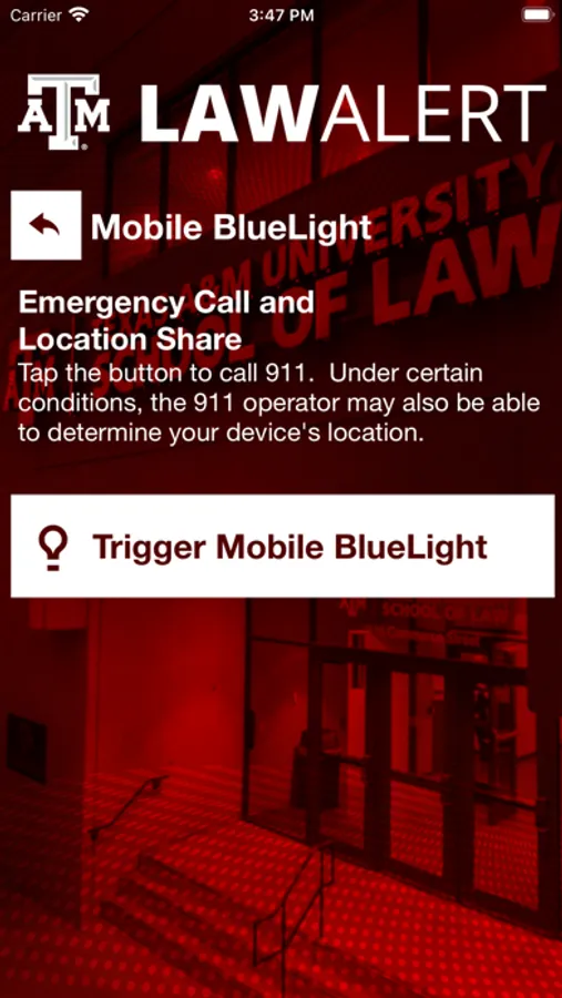 - Mobile Bluelight: Send your location to Texas A&M University School of Law security in real-time in case of a crisis