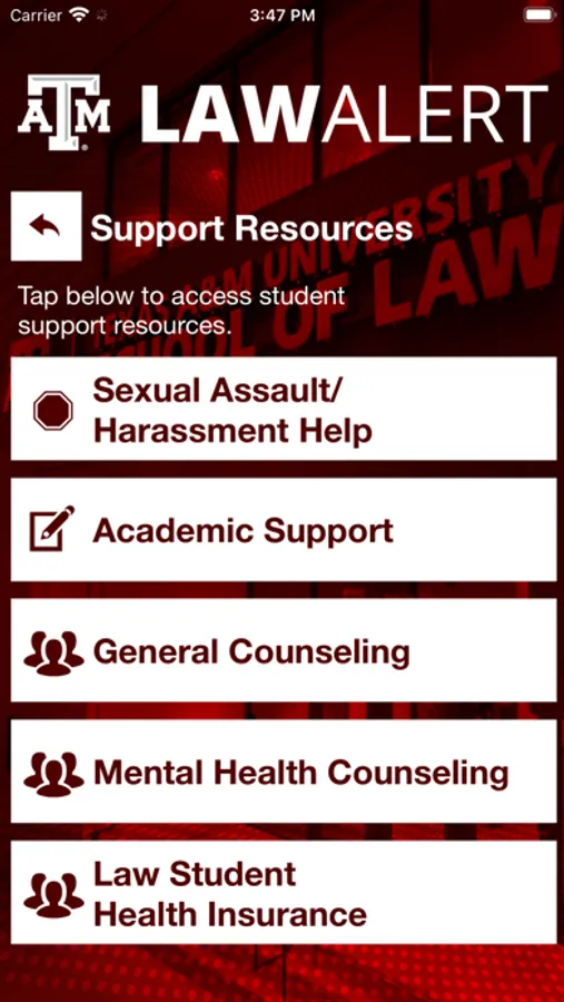- Support Resources: Access support resources in one convenient app to enjoy a successful experience at Texas A&M University School of Law.