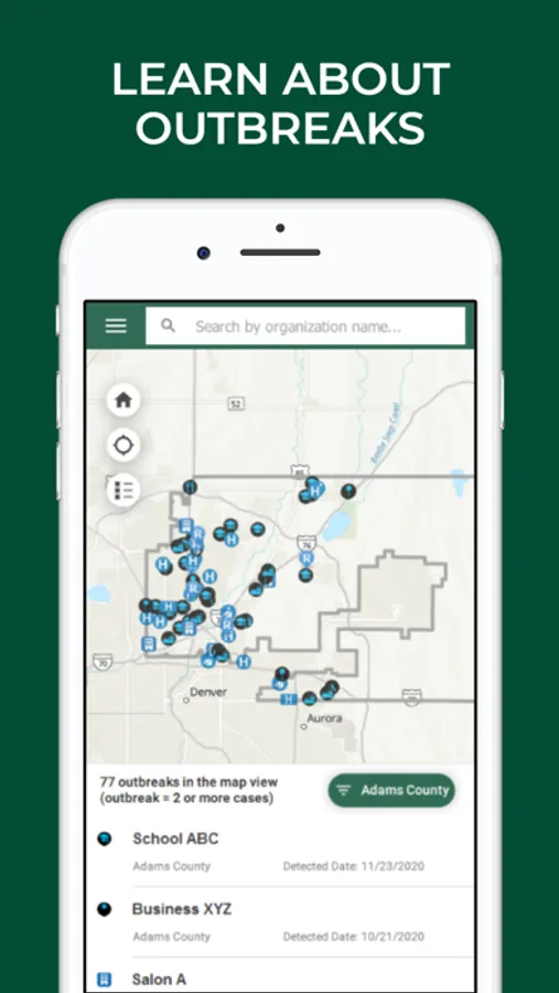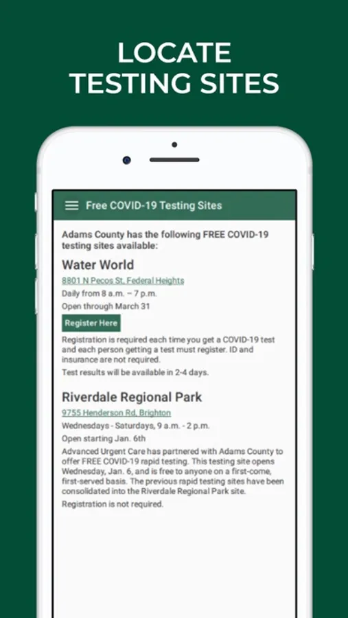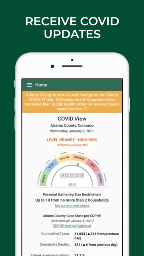 The COVID View app shows outbreak data for Adams County, Colorado, along with current case stats and restrictions. In addition, the app provides free COVID-19 testing site locations and many other COVID-19 resources. Users can also find local restaurants offering curbside and takeout services under the AdCo To Go section. If you're a local restaurant, add your restaurant to the list.