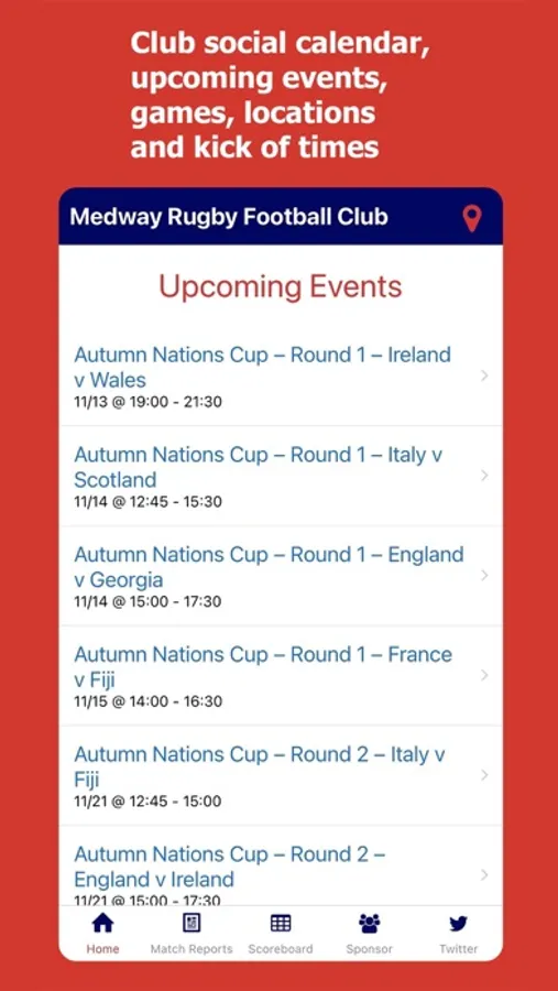 - Home page: Link to Club social calendar, scheduling all upcoming events, games, locations and kick of times