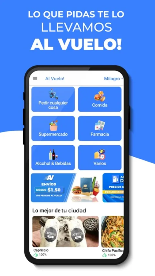 Estás en Naranjal o Milagro, ¡qué esperas para hacer tu pedido! Pide lo que quieras con Al Vuelo! Ideal para tus urgencias. Ideal para tus necesidades.