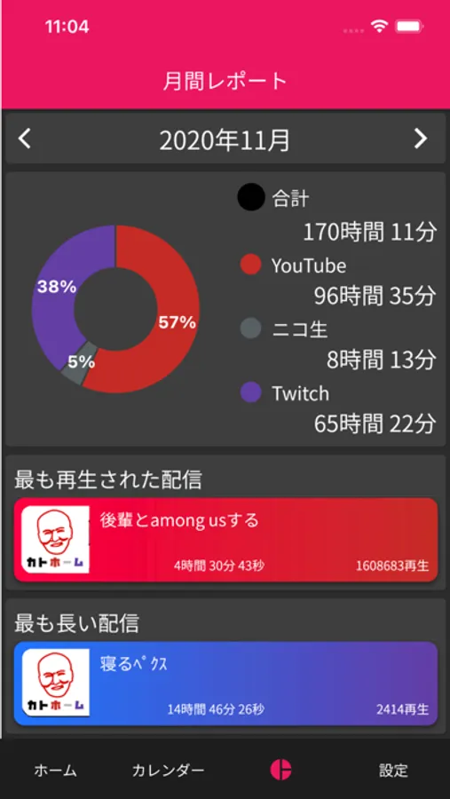 同時接続数の推移や、月ごとの配信時間の長さも分かるため、配信をより楽しめます。