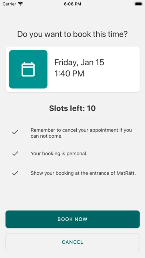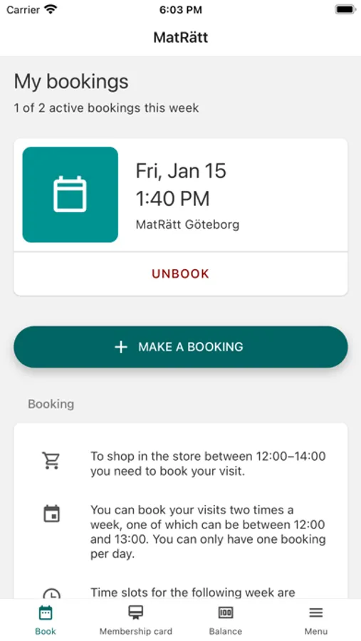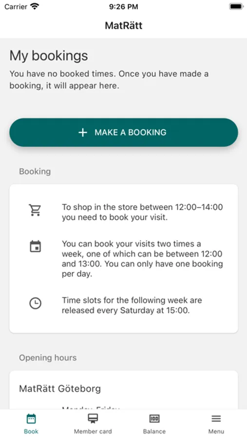 Book and plan your visits to MatRätt, Göteborg. You can book up to two visits per week between 12:00 and 14:00. Remaining opening hours, no booking required. Please note that all visits between 12:00 and 14:00 are booked via this app, regardless of purpose of visit.