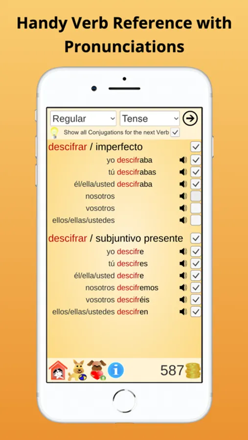 Conjugation fluency is of course the ultimate reward but it doesn’t hurt to get some incentives along the way! Earn virtual Coins as you practice: the more you practice, the more you earn, the more bonus verbs you can choose.