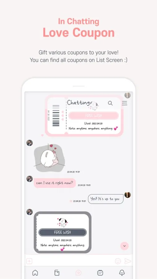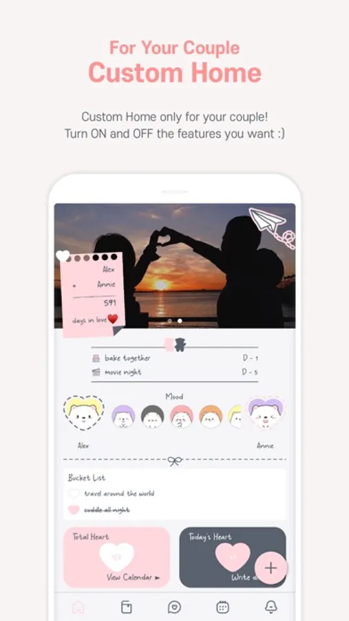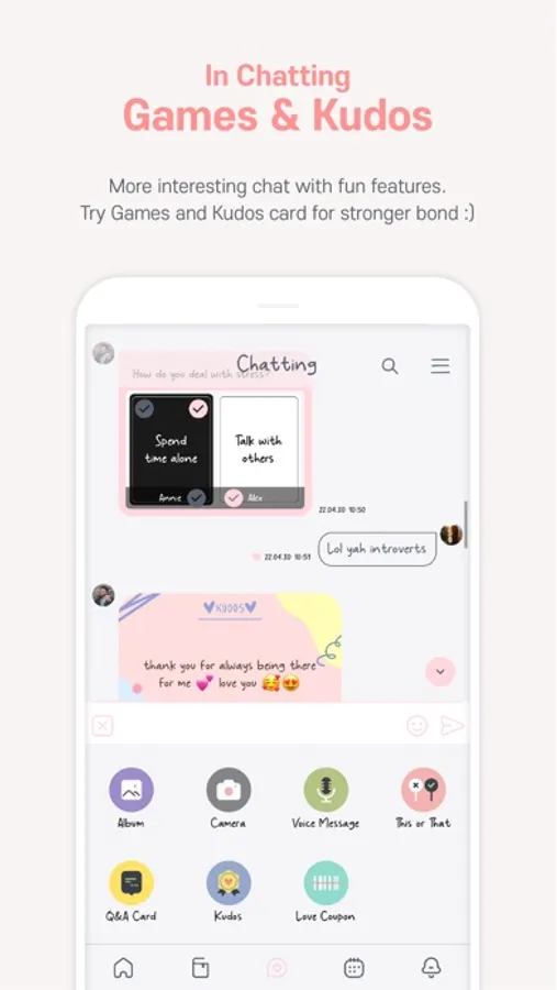 Talk with your significant half in your daily life. It's a secret and private chat only for you and your love. There is mini games and kudos card that can make a bond strogner. You can play This or That and QnA and get to know your partner's preferences. Also, keep your love's self-esteem high by sending Kudos card.