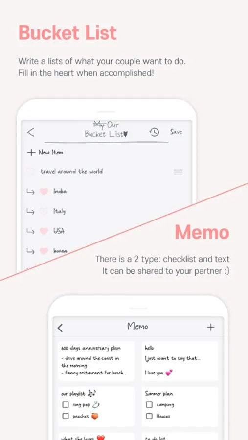There is two type of memo: Checklist and Text. You can share memo with your love.