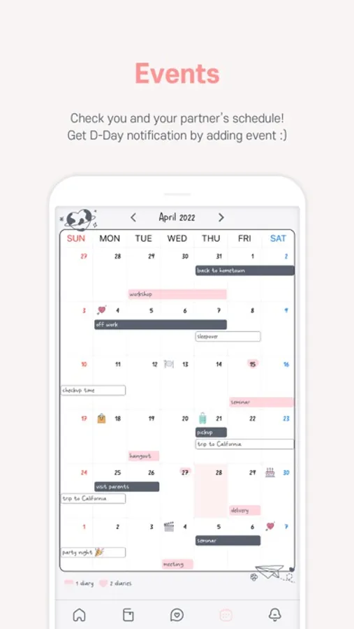 You can manage you and your partner's schedule. Receive D-Day notification prior to important event day. Check how your heart is for each month. Heart will be either half or full depending on your diaries. Ten most upcoming events' d-days are also on the home screen. Remind yourself for various anniversaries and events with your love.