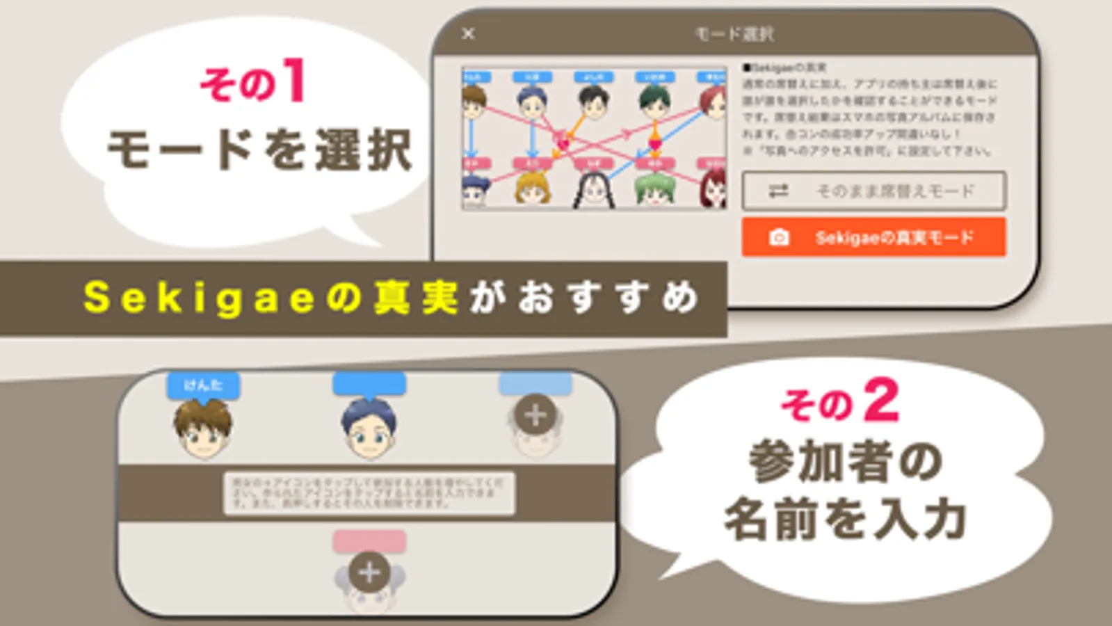 アプリに全員の名前を入力し、気になる人を選ぶと近くに座れるという仕組みを説明。