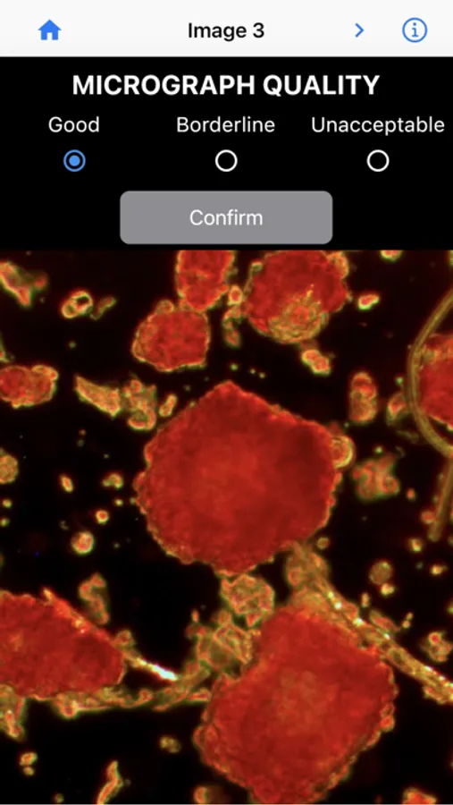 The total number of images and islets awaiting the user in the active set is visualized at the top. Three images of the active set are uploaded. For each microscopic image the quality is to be evaluated. A simple swipe gesture can be used by the user to classify contours of selected individual islets marked by arrows as true or false, or to abstain from evaluating. The overall quality of the islet contours are then evaluated. The application is designed as game with Hall of fame and awards.
