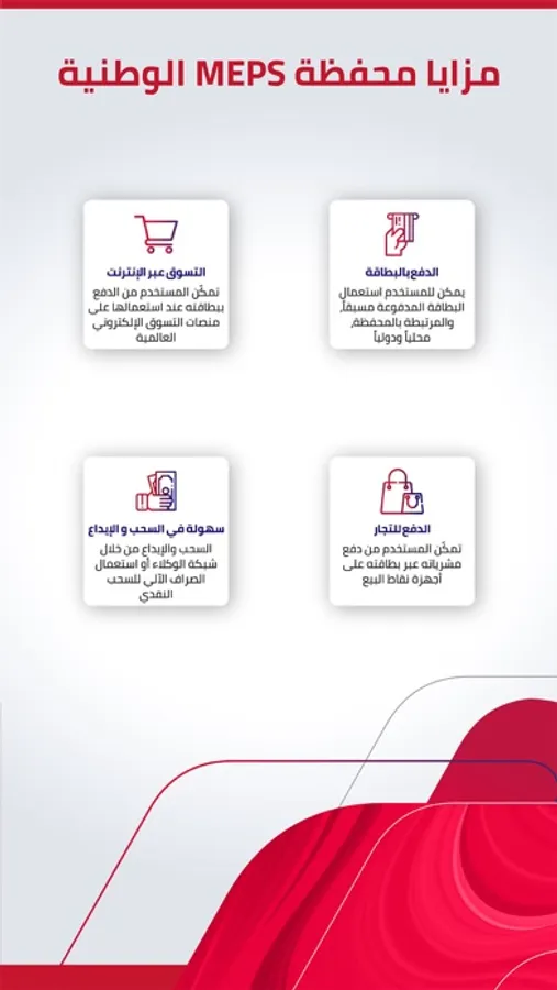 MEPS National Wallet offers payment services, using the mobile phone, by storing or keeping financial values that can be transferred to others to fulfill financial dues, and allow users to take advantage of other services provided by this unique electronic wallet.