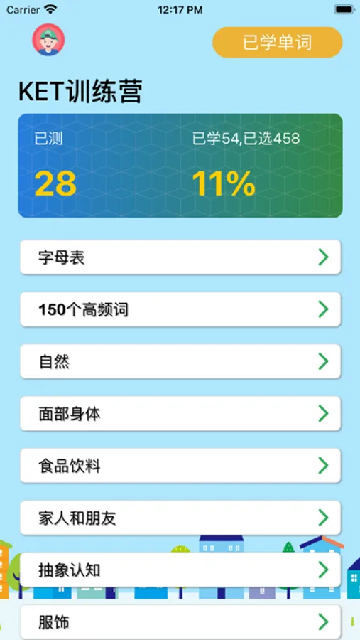 App围绕KET做了内容分类和词卡练习,帮助学习和复习KET内容。