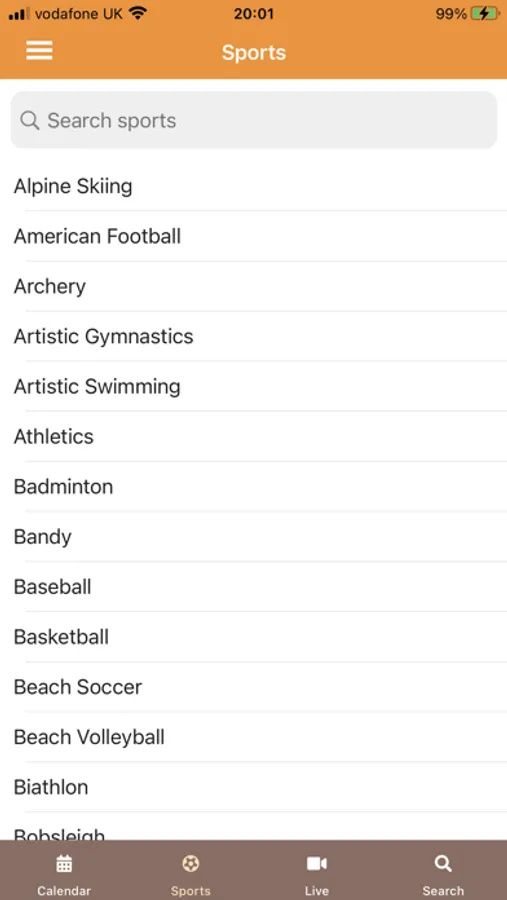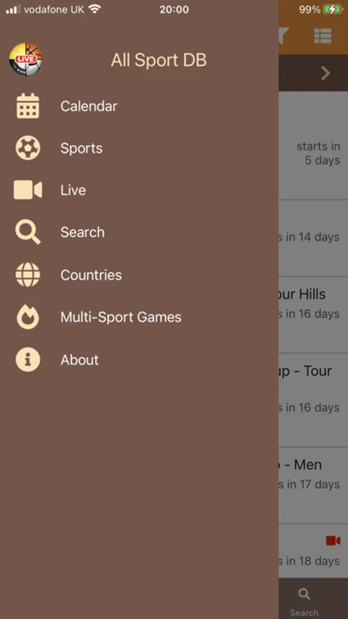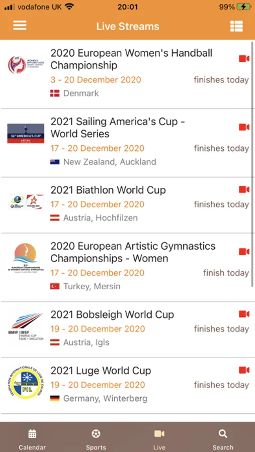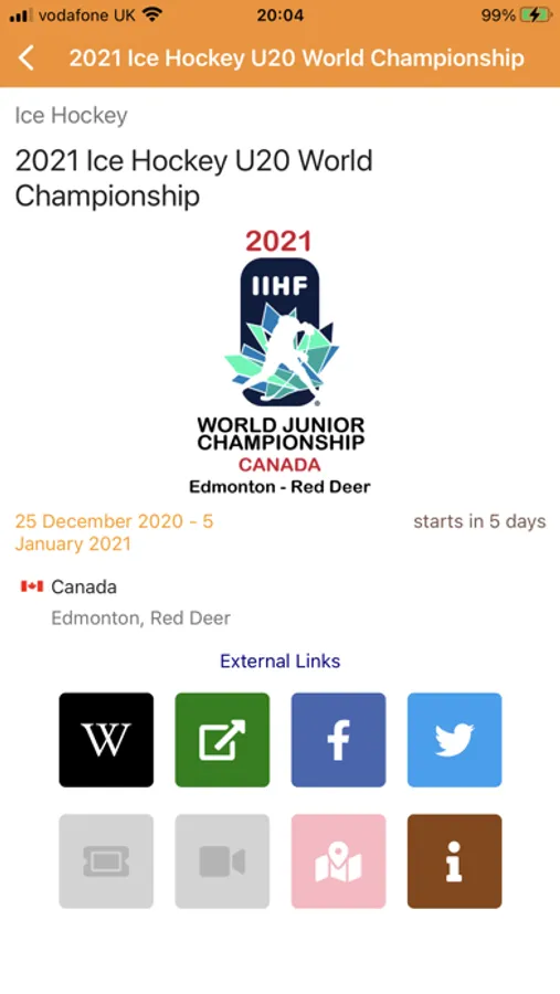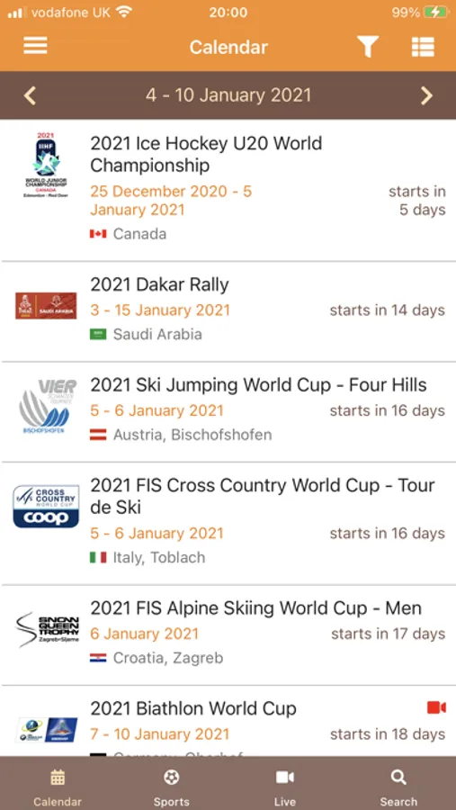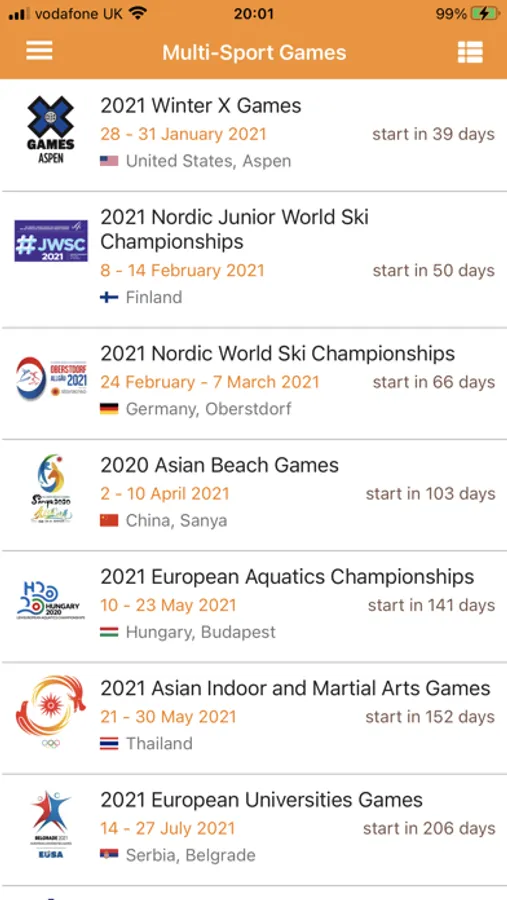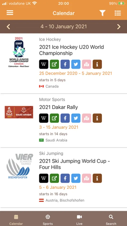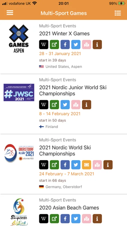 Major events happening right now are listed by default. It is possible to navigate to previous or next weeks to view events for different dates. Information is displayed with event logos and contains links to external resources: