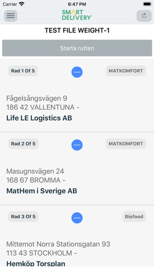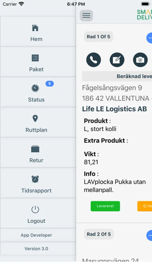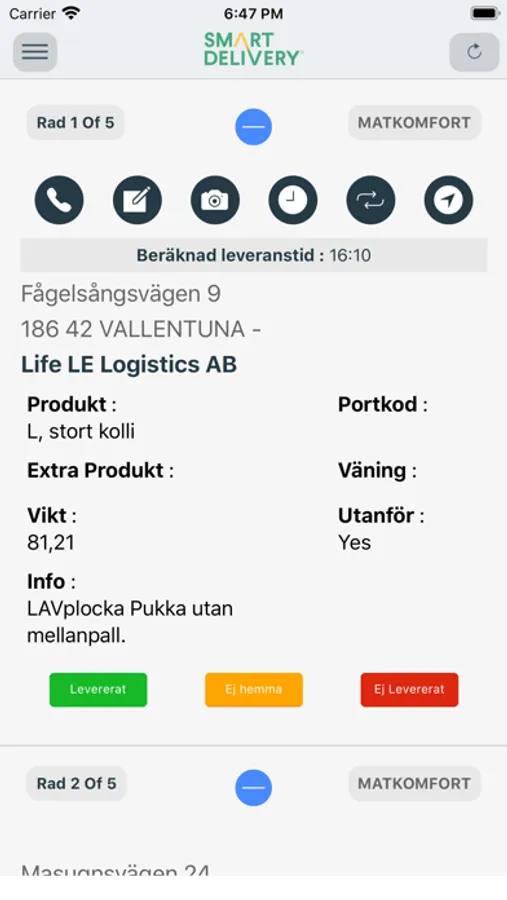 Smart Delivery optimizes and makes your routes and delivery lists more efficient, it notifies customers via SMS with the estimated time of arrival (ETA). Smart Delivery enables the customer to monitor their delivery in real time using their smartphones. The distributor, supplier and driver have full control and overview of their deliveries.