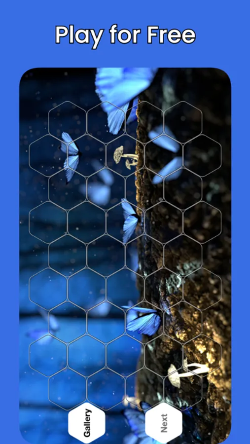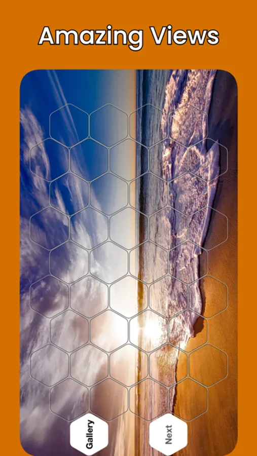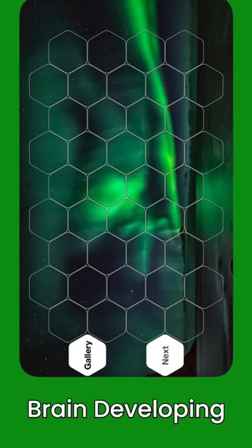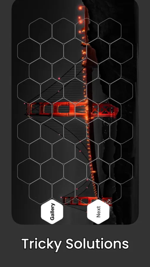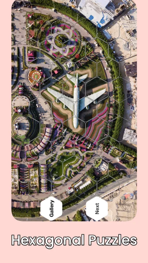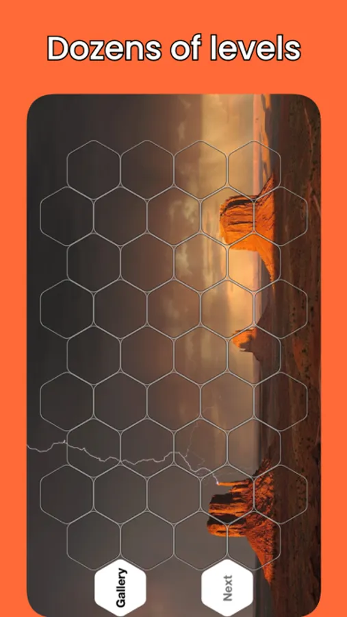 Hexagonal mosaic puzzle game featuring nature, architecture, animals, people and other themes.