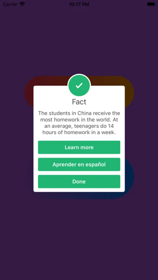In the "Fun facts" section each fact is truly random and never repeats itself, aiding in you remembering it and keeping it interesting. The fun facts can be viewed in Spanish too. The quiz in the app has a progress bar and score counter so that you can keep track.