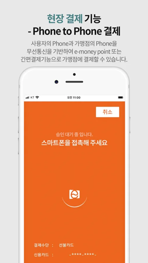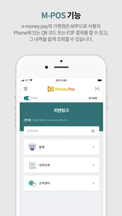 e-money pay의 가맹점은 APP으로 사용자 Phone에 있는 QR 코드 또는 Phone to Phone 결제를 할 수 있고, 그 내역을 쉽게 확인 할 수 있습니다.