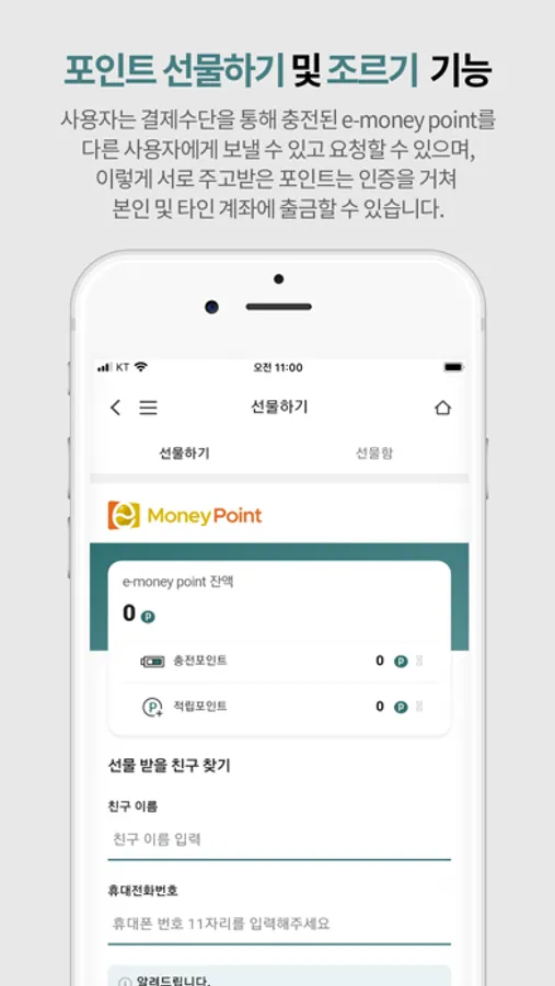 사용자는 결제수단을 통해 충전된 e-money point를 다른 사용자에게 보낼 수 있고 요청할 수 있으며, 이렇게 서로 주고받은 포인트는 수령 후 즉시 사용이 가능합니다.