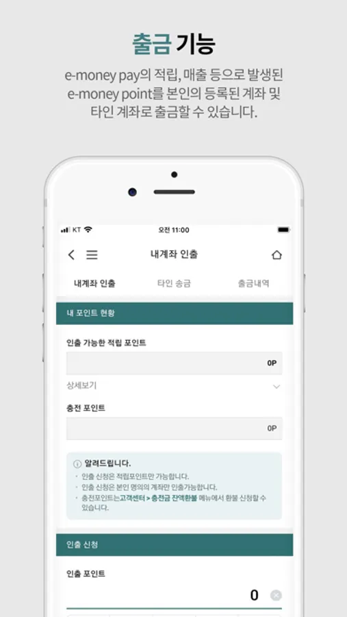 적립, 매출 등으로 발생된 e-money point를 본인의 등록된 계좌 및 타인 계좌로 출금할 수 있습니다.