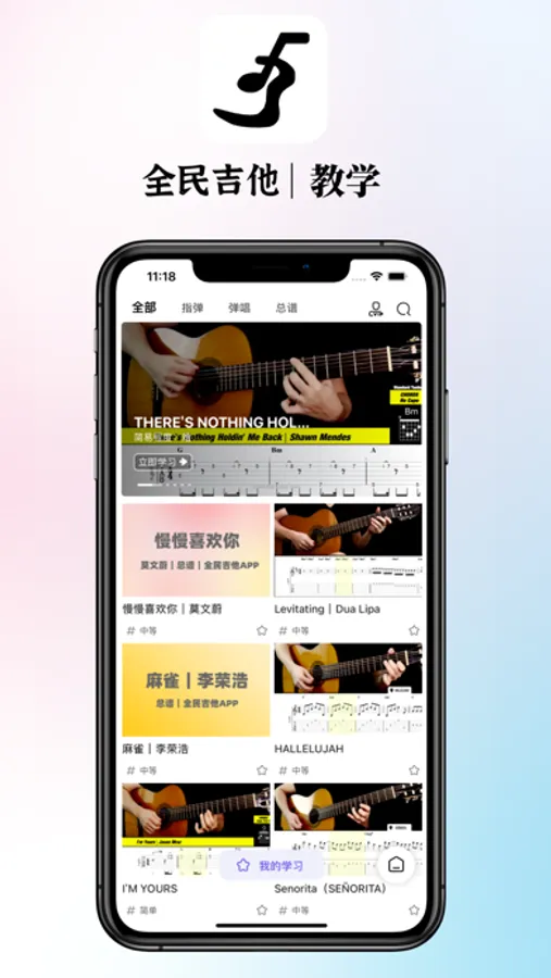 「教学」上千首歌曲的录制教学视频,学习吉他不再困惑,无需乐谱就可以跟着教学视频学习你喜欢的曲目,各类特色课程,指弹、弹唱等,适合各个阶段的你来学习。