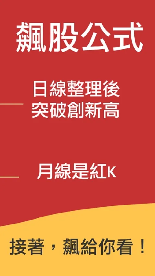・飆股公式: 日K整理後突破創新高+月K是紅K = 有潛力的飆股