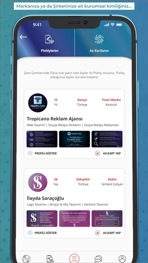 Yeni nesil (dijital) tanışma platformu Pishty ile sınırları kaldır. Gerçek bir kartvizit gibi çalışan benzersiz yapısıyla aynı zamanda uğraştığınız işin ya da markanızın reklamını da gittiğiniz her yere yanınızda götürebilmenize imkan sağlar.