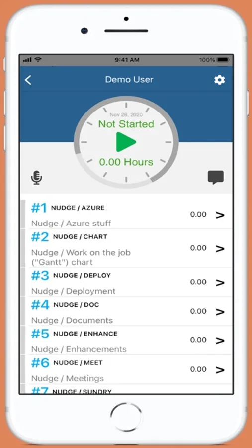 THE NUDGER captures time entry fast and accurately with minimal interruption to your workflow. Easily enter job details using voice input. Periodic reminders--“nudges”—keep time tracking accurate. View today’s time keeping on demand. THE NUDGER can export your time management data to other systems at any time. A faster and more accurate way to manage your billables.