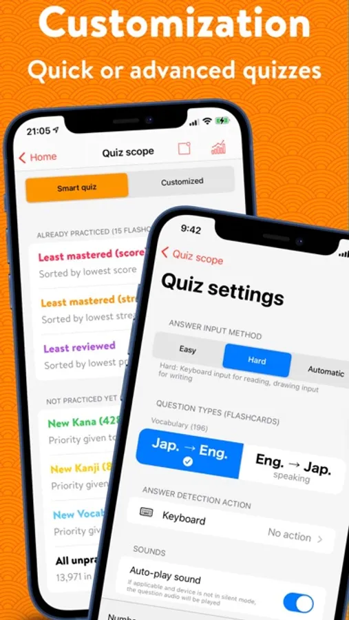 Maximum flexibility for advanced users, choose entries to be quizzed on (by applying filters, and optionally refine selection manually), choose the kind of flashcards (reading, writing, speaking and understanding) for each entry family, and input mode