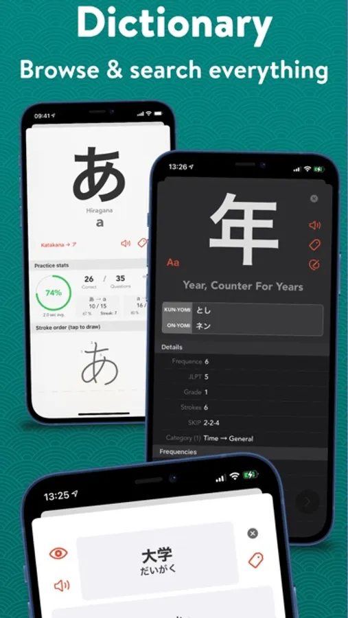 - Search and filter more than 10,000 Kanji and 8,000 Vocabulary entries plus Hiragana & Katakana