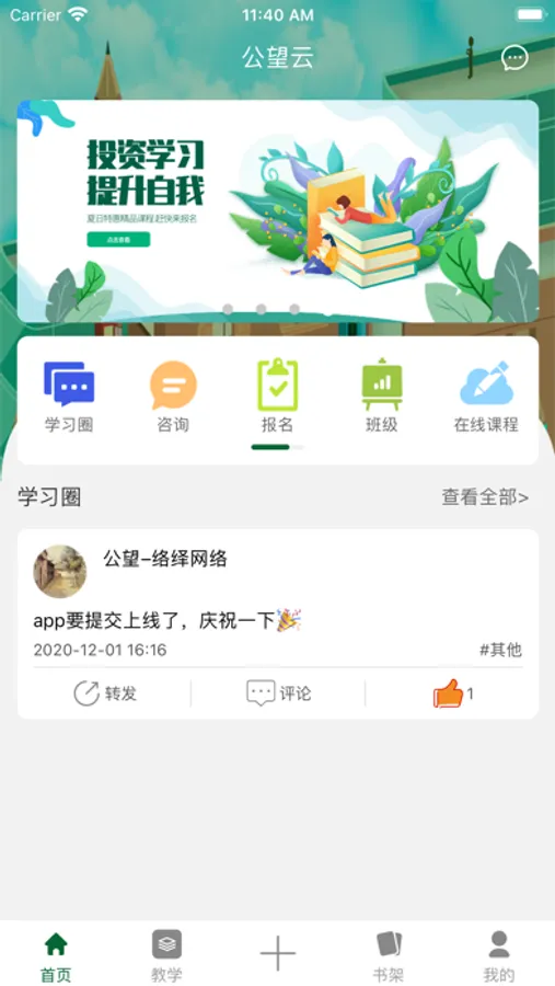 公望云APP,旨在增强学员与老师和家长之间的交流学习,以及为师生搭建网上互动桥梁。APP增加了学习圈、在线课程、提供线上教学以及离线教学模式,并提供多种班级选择。APP中拥有庞大的教学资源,类如课件、视频、电子书等教学资料,教师可以在线制作课件,录入音屏等操作,使教学更加方便。公望云APP为家长提供了解我校的先进教学理念以及强大的师资力量的功能,以及为家长和学生提供在线咨询等功能,还可以通过APP能及时了解最新的报考信息,为学生解决升学问题。