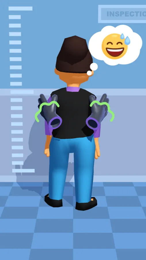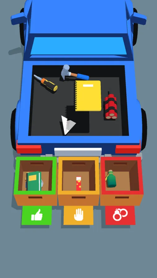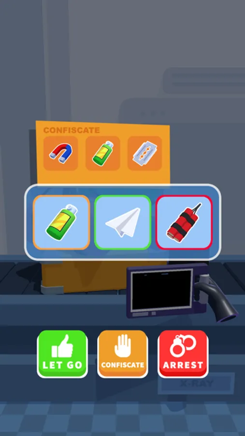 Complete routine tasks of a border inspector. Find different objects that criminals try to smuggle through the border under their cars, in the car trunks, in their luggage or under their dress. Use the mirror to locate objects under the car. Sort the mess in the car trunk to find inappropriate objects. Use your hands to search objects under their dress. Locate the objects in the luggage with your hand x-ray scanner.