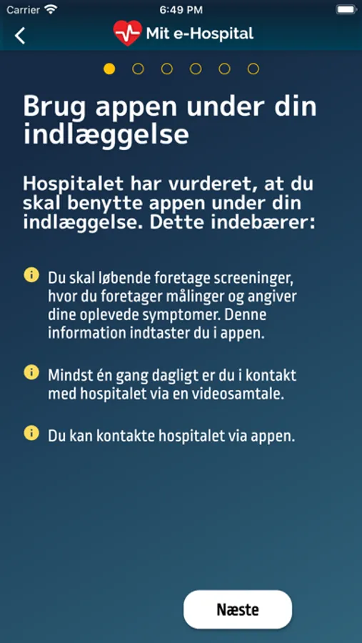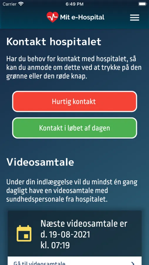 Appen giver dig mulighed for at kontakte hospitalet direkte (akut/ikke akut) og holde overblik over dagens aftaler med hospitalet. Via appen skal du indberette dine vitale parametre og deltage i videokonsultationer i overensstemmelse med hospitalets anvisninger, som fremgår af appen. Du modtager notifikationer inden dine aftaler med hospitalet og opfordres til at overholde tiderne.