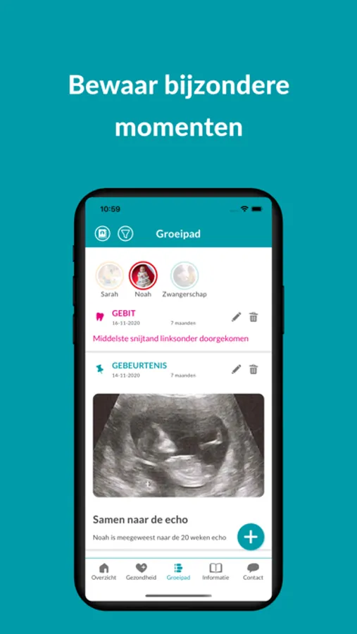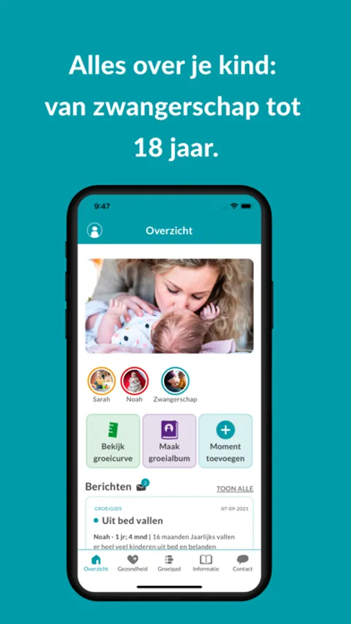 Volg de groei en ontwikkeling van je zwangerschap of kind met onze gratis GroeiGids app. Vind betrouwbare informatie, volg de groeicurves en leg bijzonder momenten vast in het groeipad. Inclusief foto’s en filmpjes. Zo maak je een groeialbum als herinnering voor later.