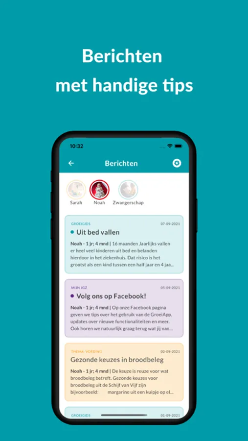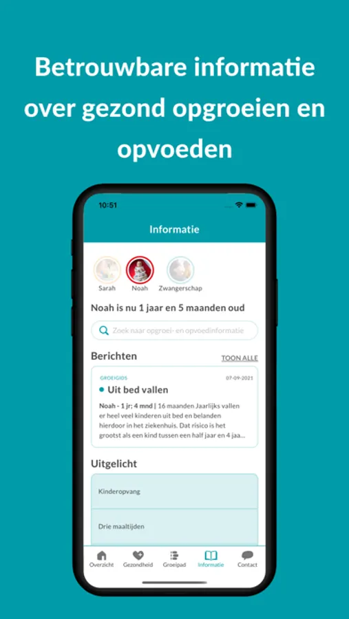 We willen je ondersteunen in elke fase van het ouderschap. Je ontvangt daarom via de app handige berichten, passend bij de duur van je zwangerschap of de leeftijd van je kind. Tot je kind 18 jaar is! Bovendien vind je in de app betrouwbare en onafhankelijke informatie (zonder reclame) over gezondheid, ontwikkeling, opvoeden en ouderschap.