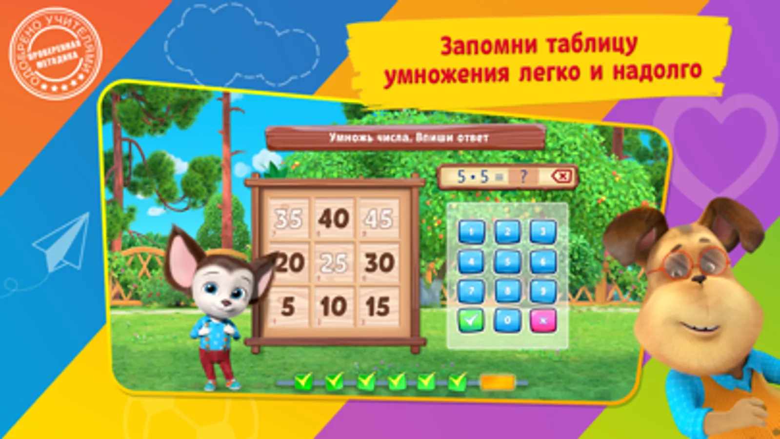 В детском приложении – тренажере таблицы умножения – обучение идёт в удобной для запоминания форме от простого к сложному, от сложения к умножению. Осваивая навык умножения, дети получают игровые призы. Игра с любимыми героями Барбоскиными отлично мотивирует ребенка, и он движется от одного успешно выполненного блока к другому.