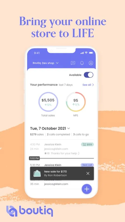 Online shopping has always lacked the high touch experience that can only be offered in person. Boutiq finally bridges that gap between online and offline shopping. By letting your clients video chat with a sales associate instantly or by appointment, you can offer them a personalized shopping experience, add the human touch and bring your online store to life.