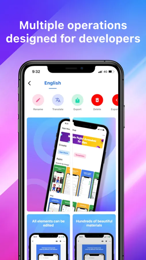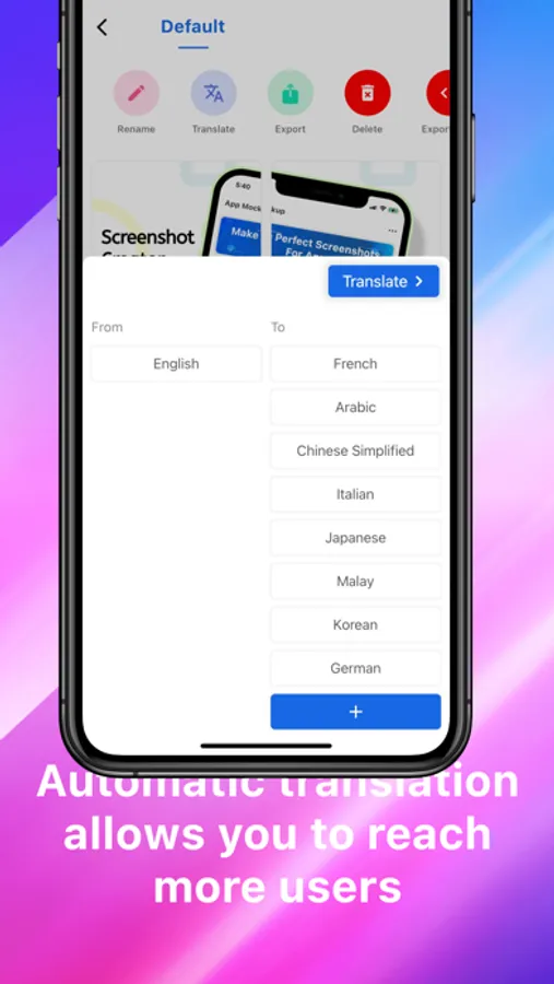 Translate, localize and export your screenshots for more countries. Instant translation into 38 languages. Localising your app could help reach an additional 40% of the world!
