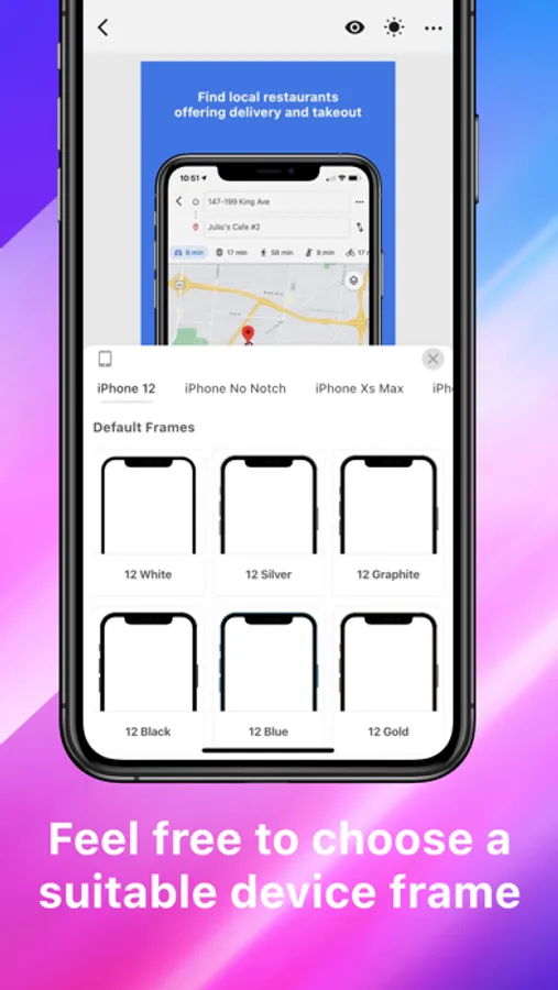 Choose real devices, solid color or clay frames. Resize, rotate and position the device anywhere in the screenshot. You can even add two devices.
