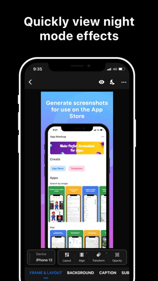 See how your screenshots will look on the App Store and Play Store for every device. You can even preview in Dark Mode.