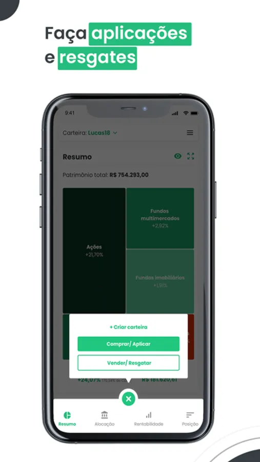 - Renda fixa: CDB, LCI/LCA, Debêntures, CRI/CRA, Títulos Públicos e Fundos de Renda Fixa;