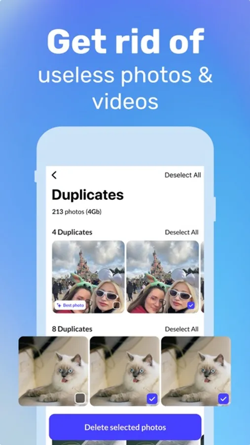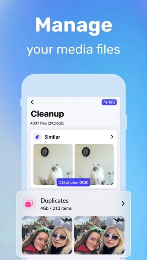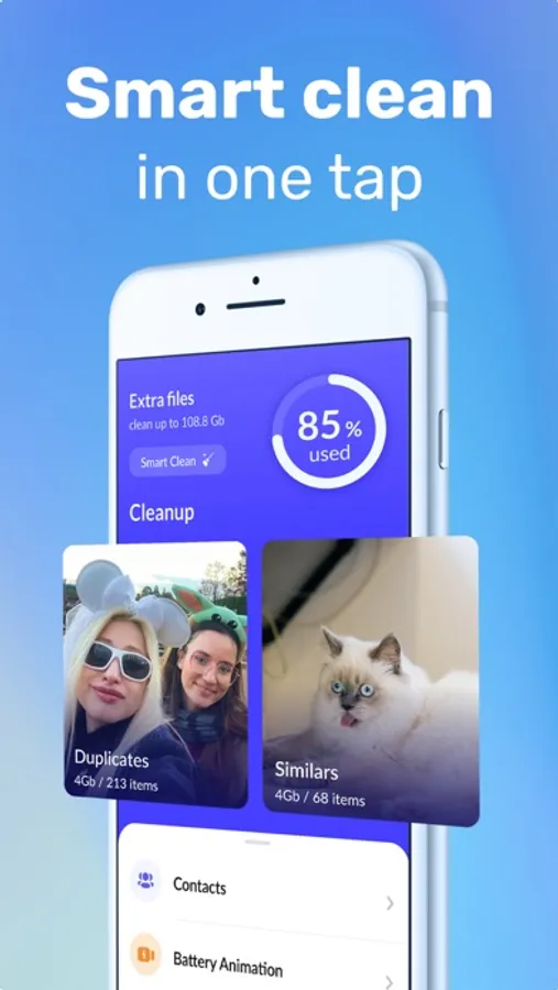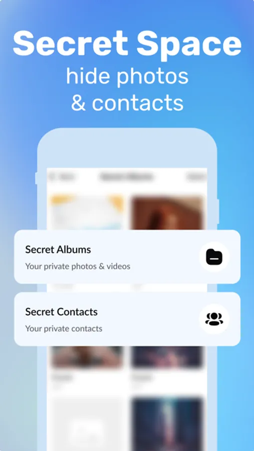 Clean up your device by using a unique smart cleaner. You can clean up similar photos and videos with a few taps. You do not only delete similars but can add photos and videos to Secret Albums, as well as contacts to Secret Contacts. Information in Secret Space will be securely hidden from prying eyes with Passcode Protection.